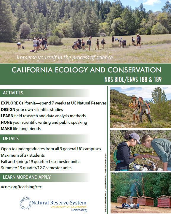 This is a reminder that applications for the Summer 2022 offering of the UC Natural Reserve System field program, California Ecology and Conservation are due on February 11, 2022. Applications can be found here. Please spread the word!